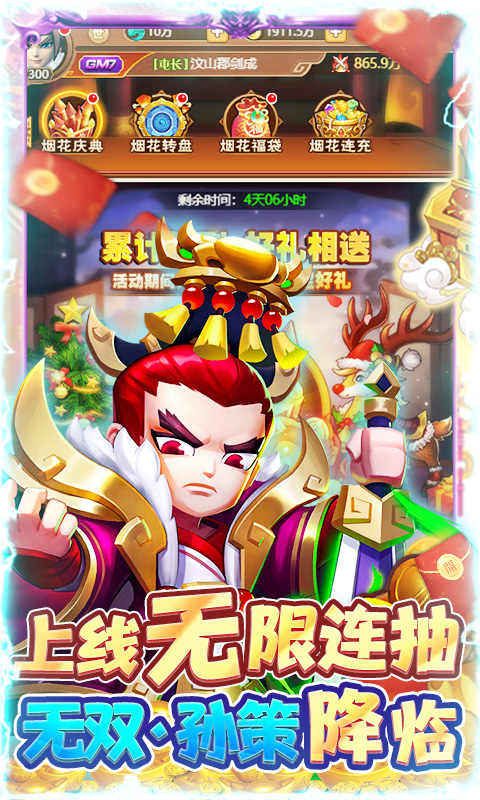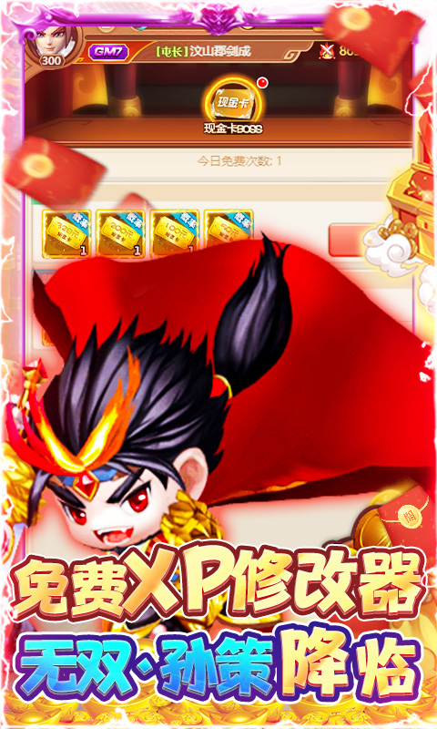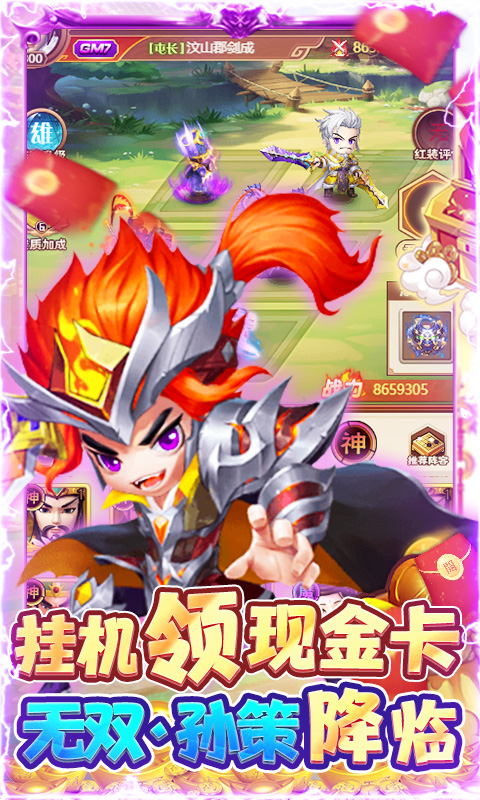 遊戲介紹:上線激活百萬紅包活動,來玩再送我是GM特權,元寶*2888888,遊戲挂機也能獲得現金卡,使用可激活所有充值活動。超炫萌系畫風,結合卡牌體系,玩家親臨其境,將各路三國英雄收入麾下,一統三國,遊戲簡單容易上手,輕松滑動指尖,放置挂機養成,給您不一樣的遊戲體驗!